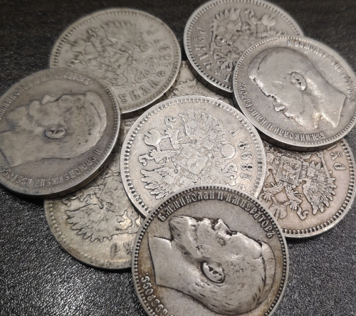 Реверс: В центре изображен Малый Государственный Герб Российской империи - двуглавый орёл, головы которого увенчаны двумя коронами, третья, большая корона над ними. Все они соединены орденской лентой ордена Св. Апостола Андрея Первозванного. На груди орла расположен Московский герб, в щите изображен Георгий Победоносец с копьем поражающий дракона. Вокруг щита цепь ордена Св. Апостола Андрея Первозванного. На крыльях изображены гербы: Царства Казанского, Польского, Херсонеса Таврического, Астраханского, Сибирского, Грузинского и герб соединенных княжеств Киевского, Новгородского и Владимирского — по 4 на каждое крыло. В правой лапе орла – скипетр, в левой – держава. Под ним слева направо изображены: номинал - надпись «РУБЛЬ», цветочная розетка и дата выпуска «---- Г.». По окружности канта имеются рельефные элементы, выполненные в виде зубцов.
