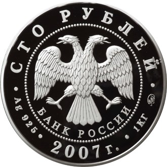 в центре – эмблема Банка России (двуглавый орёл с опущенными крыльями, под ним – надпись полукругом «БАНК РОССИИ»), обрамленная кругом из точек и надписями по кругу – вверху: «СТО РУБЛЕЙ», внизу: слева – обозначения драгоценного металла и пробы сплава, в центре – дата выпуска «2007 г.», справа – содержание химически чистого металла и товарный знак монетного двора.
