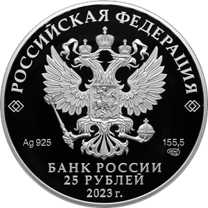 рельефное изображение Государственного герба Российской Федерации, над ним вдоль канта – надпись полукругом: «РОССИЙСКАЯ ФЕДЕРАЦИЯ», обрамленная с обеих сторон сдвоенными ромбами, под гербом: слева – обозначения драгоценного металла и пробы сплава, справа – содержание химически чистого металла и товарный знак монетного двора, внизу в центре в три строки – надпись: «БАНК РОССИИ», номинал монеты: «25 РУБЛЕЙ», год выпуска: «2023 г.».