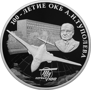 Серебряная монета 3 рубля "100-летие со дня создания ОКБ А.Н. Туполева" 2022г., 31,1 г. 925 проба, ПРУФ