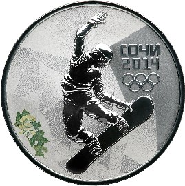 Серебряная монета 3 рубля "Сочи 2014" - "Сноуборд" СПМД, 31,1г.