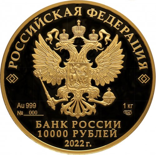 рельефное изображение Государственного герба Российской Федерации, над ним вдоль канта — надпись полукругом: «РОССИЙСКАЯ ФЕДЕРАЦИЯ», обрамленная с обеих сторон сдвоенными ромбами, внизу под гербом в две строки: слева — обозначения драгоценного металла, пробы и порядковый номер монеты, справа — содержание химически чистого металла и товарный знак монетного двора, внизу в центре в три строки — надпись: «БАНК РОССИИ», номинал монеты: «10000 РУБЛЕЙ», год выпуска: «2022 г.».