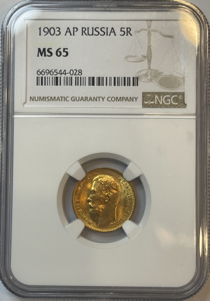 Золотая монета 5 рублей Николай II ,1903 г. АР, в слабе NGC MS 65