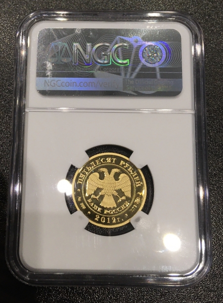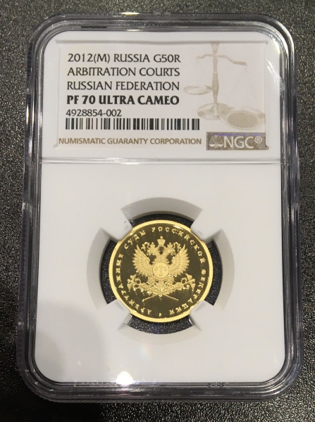 Золотая монета 50 рублей "Система арбитражных судов Российской Федерации" 2012г., 7,78г., Au 999, в СЛАБЕ NGC PROOF 70