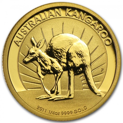 На реверсе представлен кенгуру — символ Австралии. Изображение меняется каждый год. Надпись AUSTRALIAN KANGAROO — австралийский кенгуру. Также указаны год выпуска монеты, вес 1/4 oz. и проба золота 0.9999. На данной монете изображен прыгающий кенгуру.