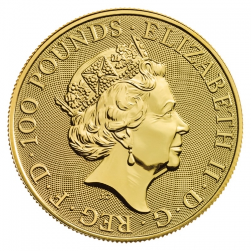 • На аверсе изображен портрет королевы Елизаветы II на узорчатом фоне. По ободу помещены следующие надписи: «ELIZABETH II D G REG F D 100 POUNDS» (Елизавета II Милостью Божьей Королева, Защитница Веры; номинал – 100 фунтов стерлингов).